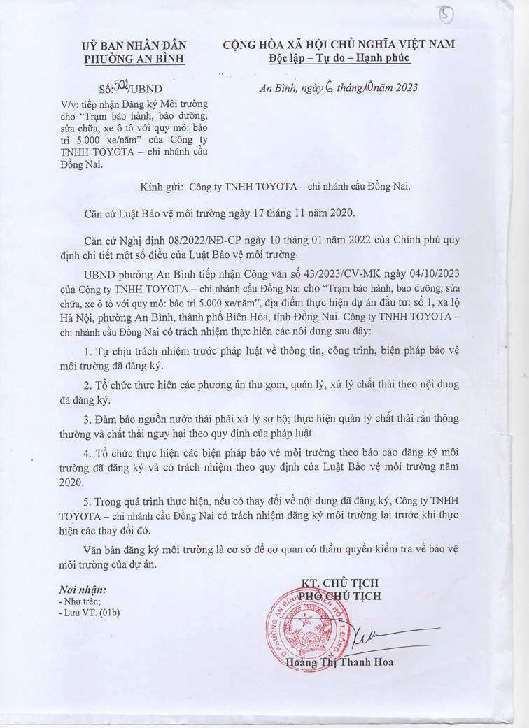 Toyota Biên Hòa - CN Cầu Đồng Nai cam kết thực hiện đúng theo các nội dung trong văn bản đăng ký môi trường